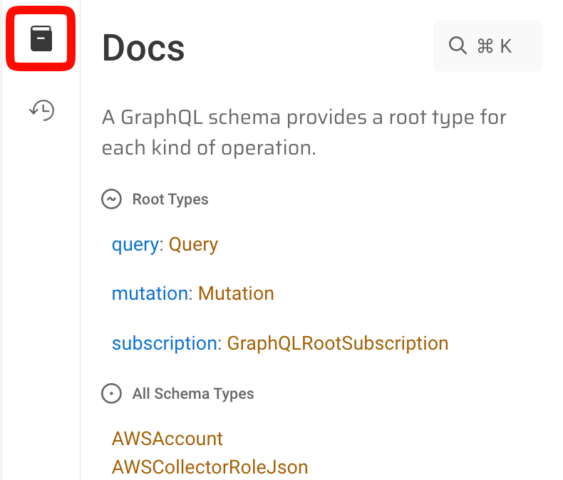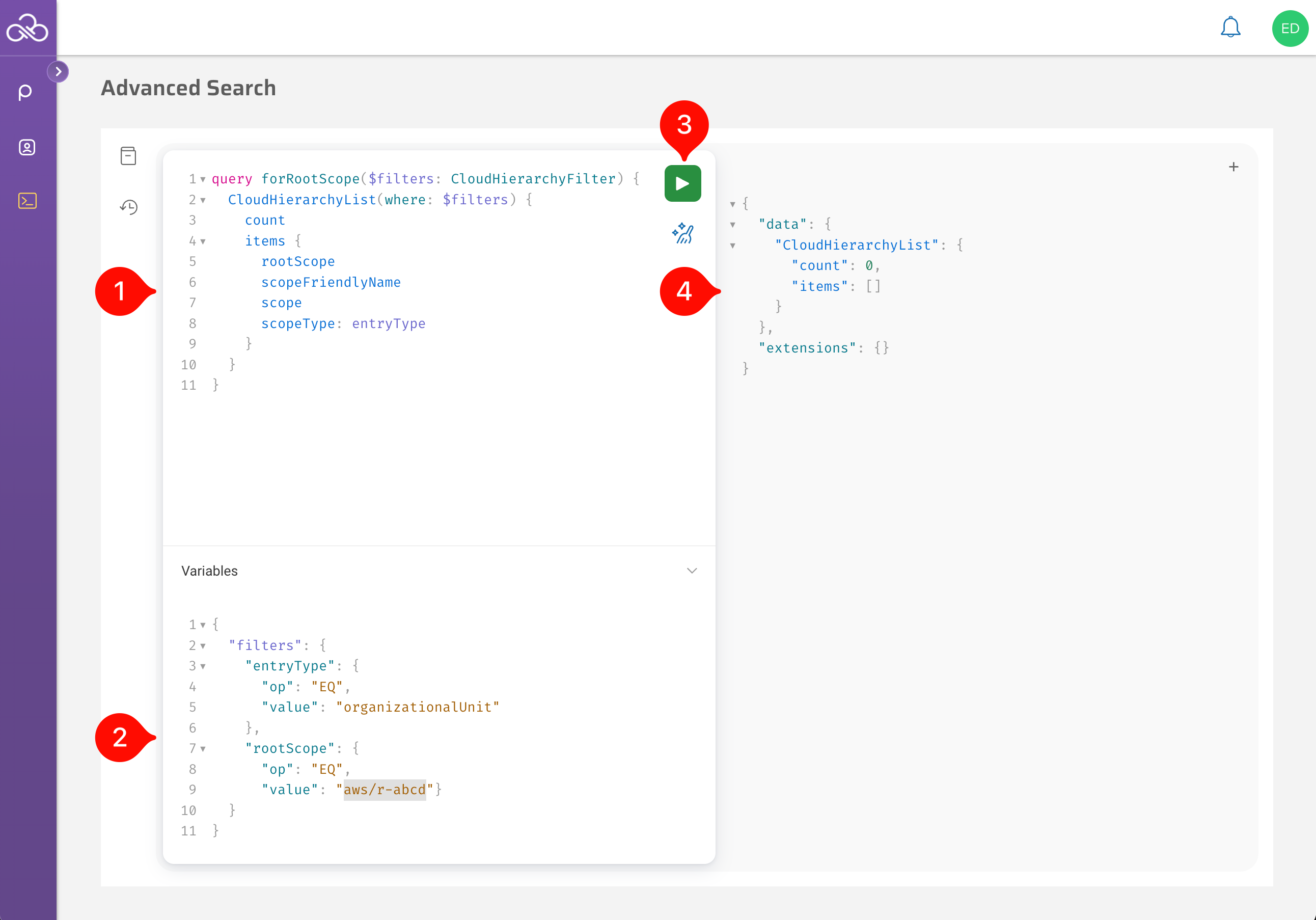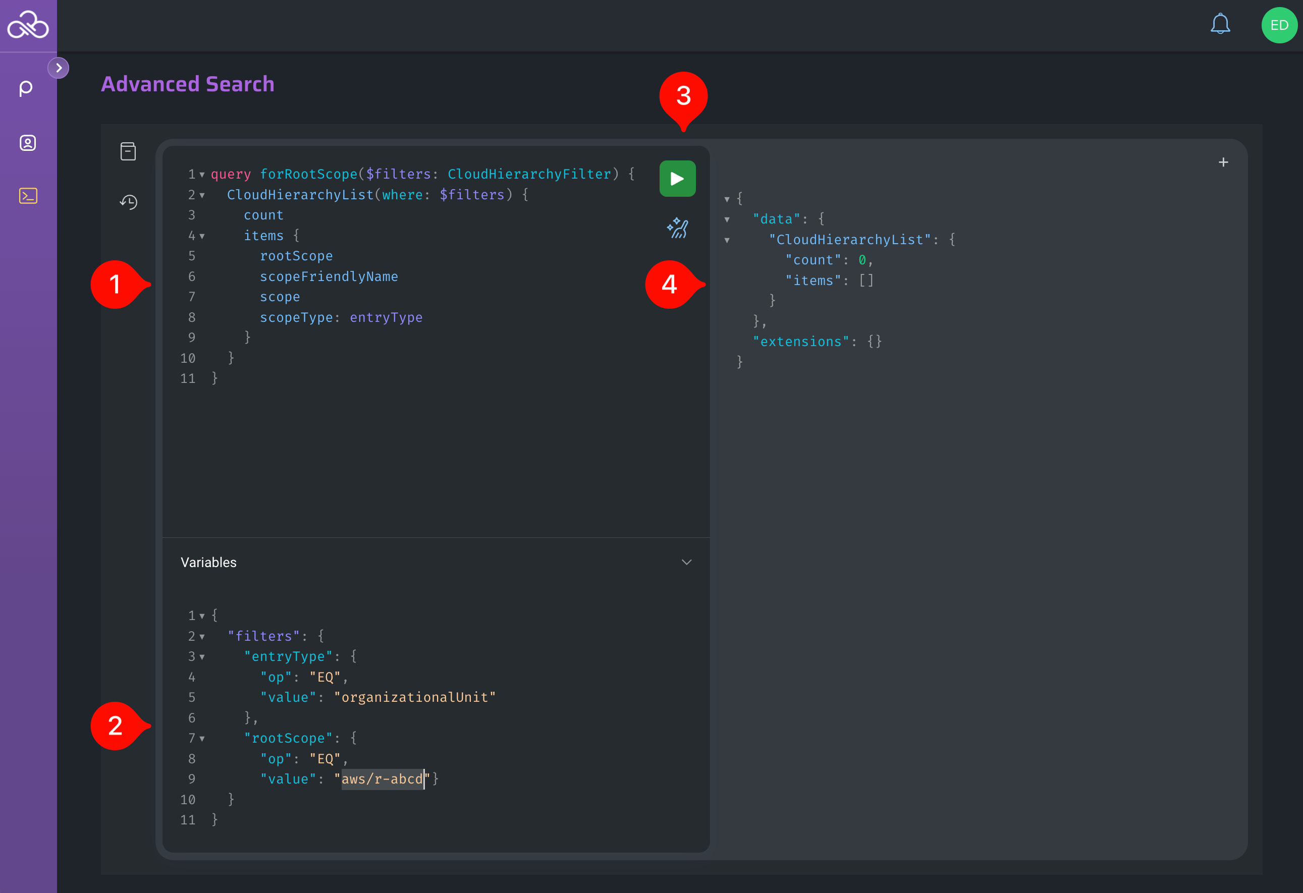 Sonrai Advanced Search supports the full GraphQL query language, giving you the ability to build and test complex query logic, or create mutations that alter your Sonrai configuration. A set of sample queries and mutations are available, showing some common use cases for information to query, or configuration changes to apply.
