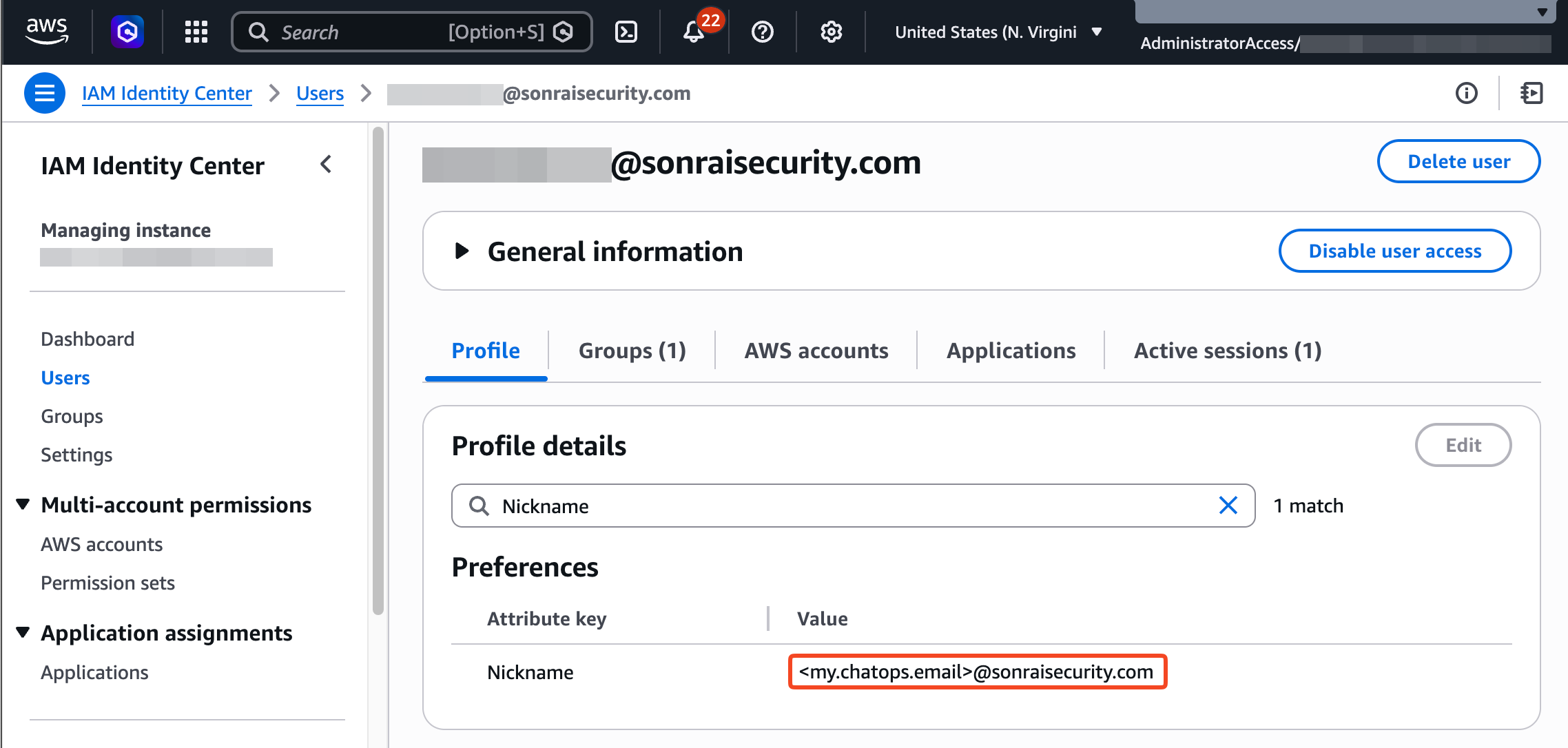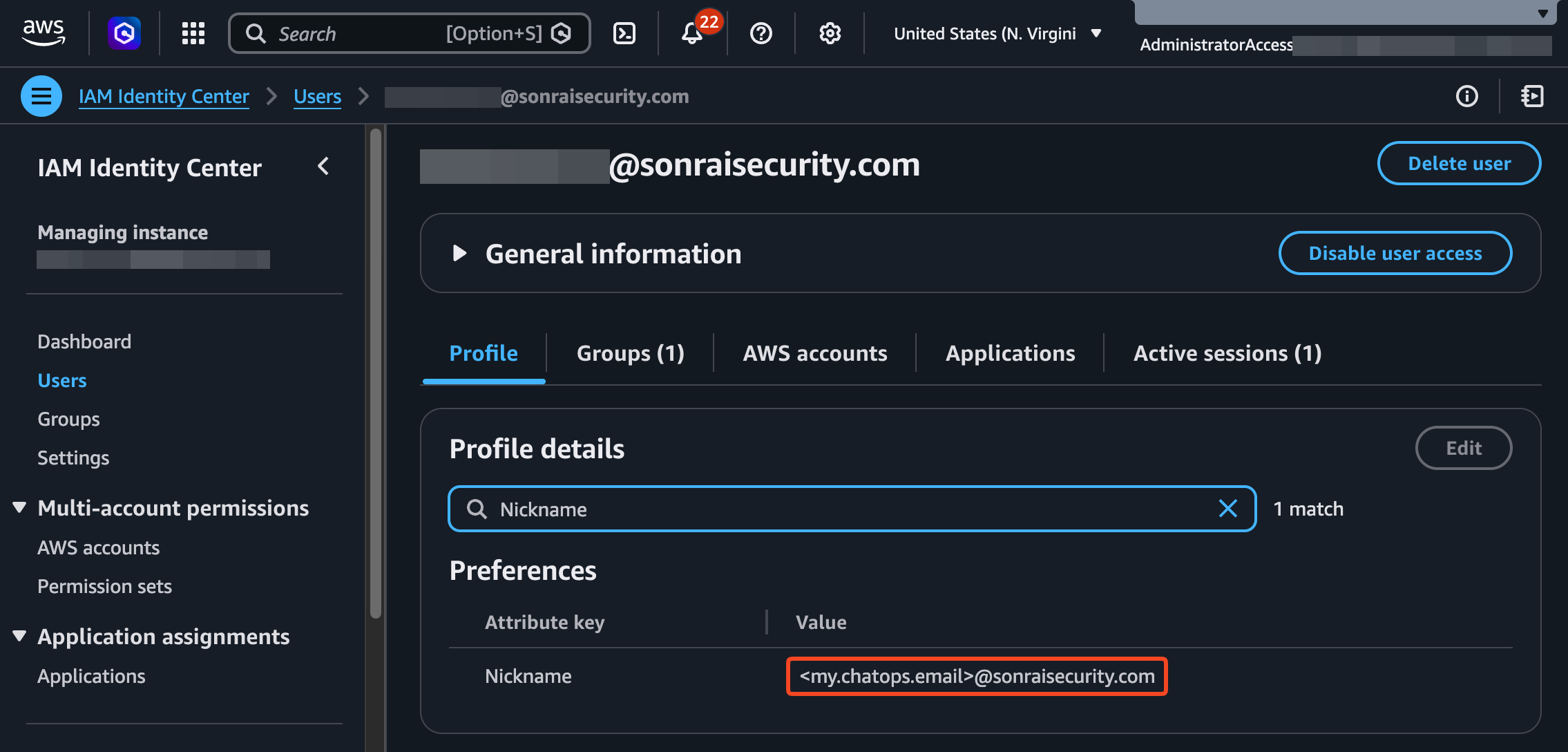 - Once enabled, populate the chosen field in AWS with alternate identities that your admin users will use for ChatOps login. For example, if using the Nickname field then an admin user might look something like this: