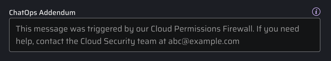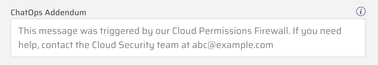 A ChatOps Addendum is a customizable message automatically appended to supported ChatOps notifications. Configure this feature to give your users helpful context — such as which team to contact, an escalation email address, or guidance on why they are encountering a particular control.
