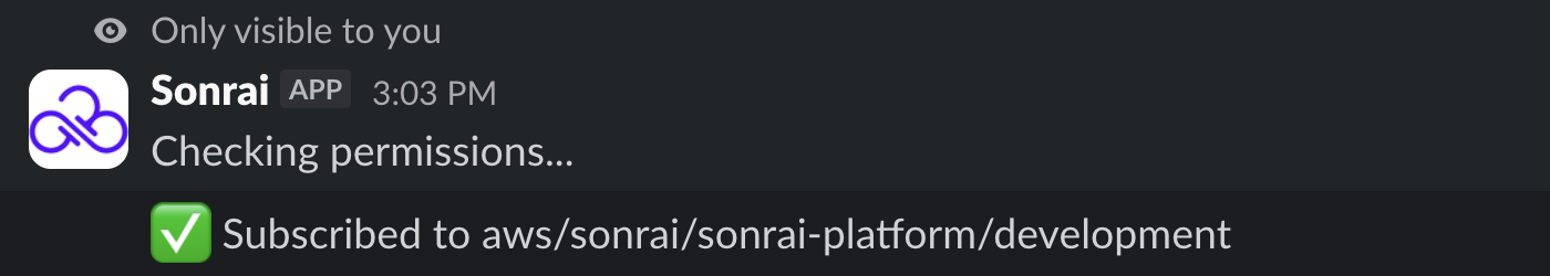 The Sonrai app will check permissions for the user running this command, and then return a confirmation once the subscription is successfully created.