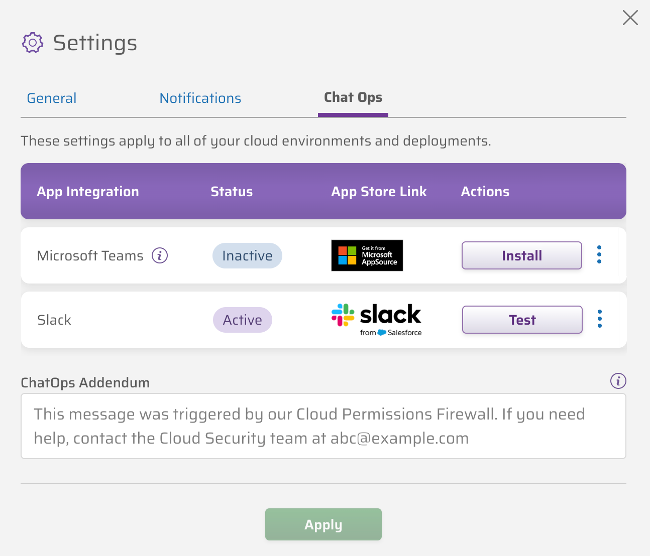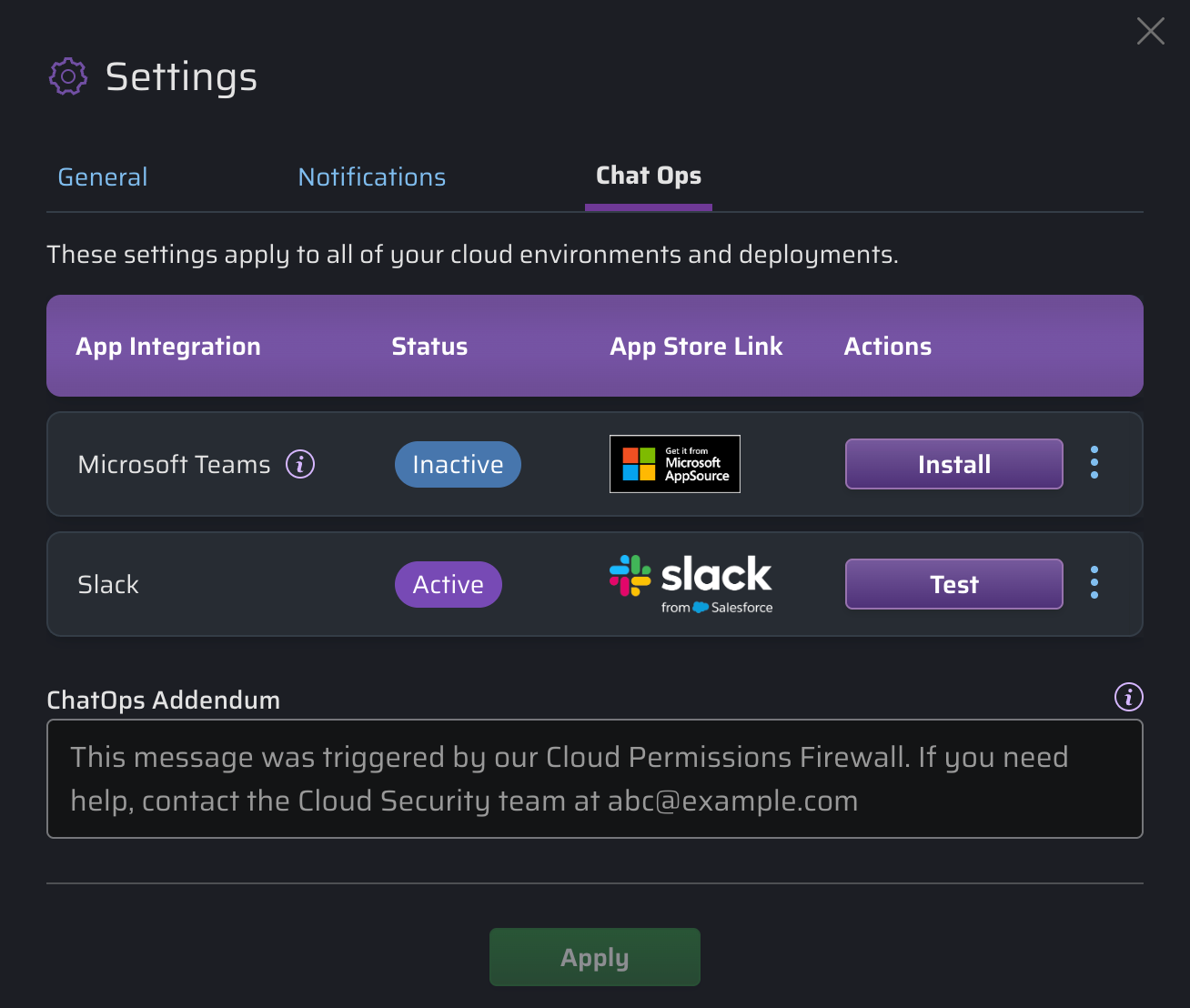 The Chat Ops section shows if you currently have a chat client (Slack or Microsoft Teams) install and connected to your Sonrai deployment.