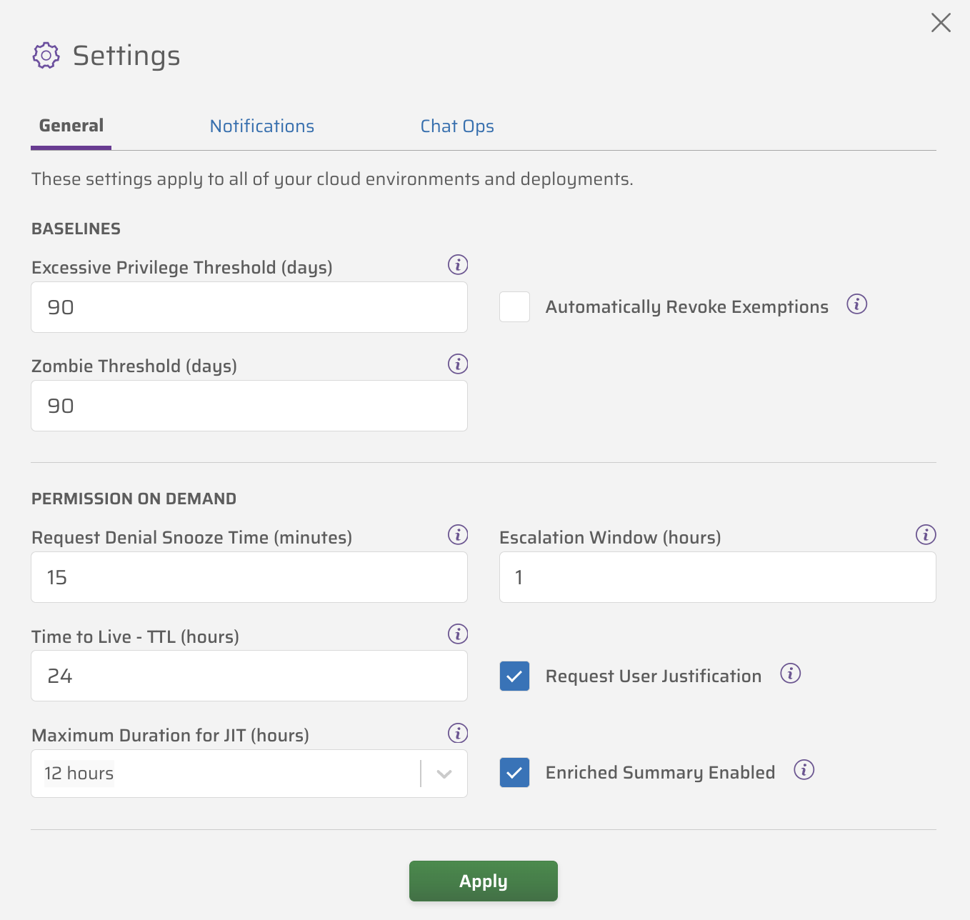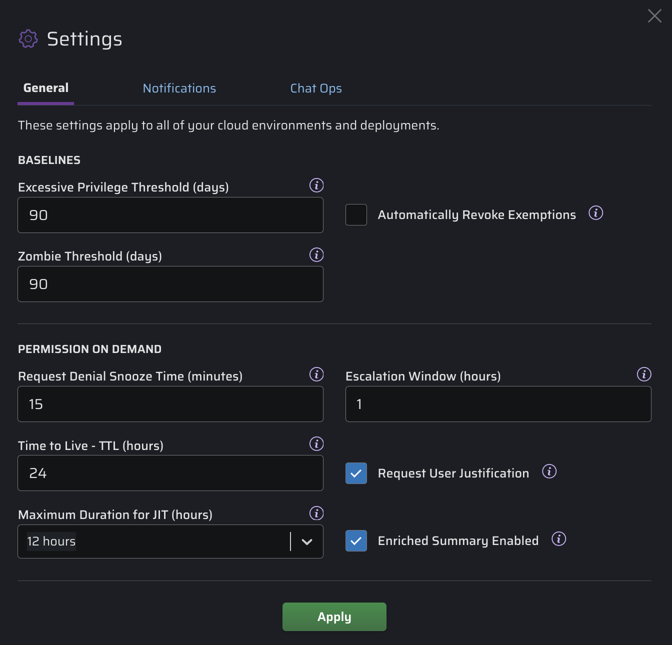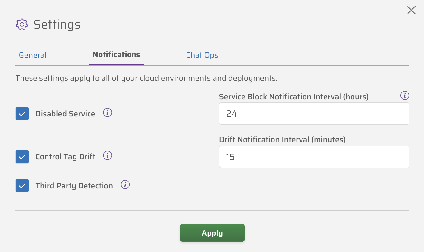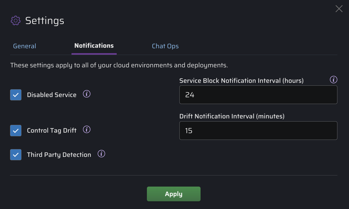 Service Block Notification Interval (hours) - The time period for suppressing repetitive notifications to a Requester through ChatOps for attempts to access the same service which is blocked by the Cloud Permissions Firewall (default: 24 hours).