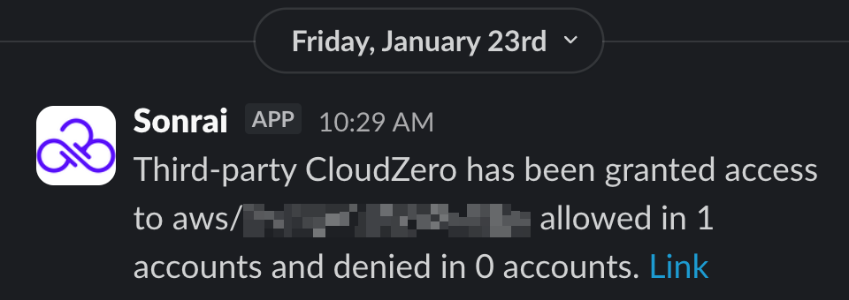 When a new third-party account is detected, Sonrai generates a ChatOps notification that includes: