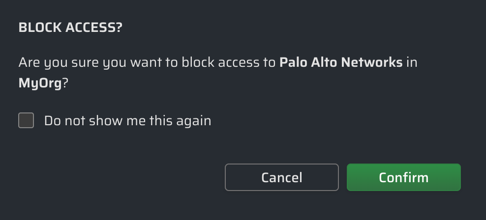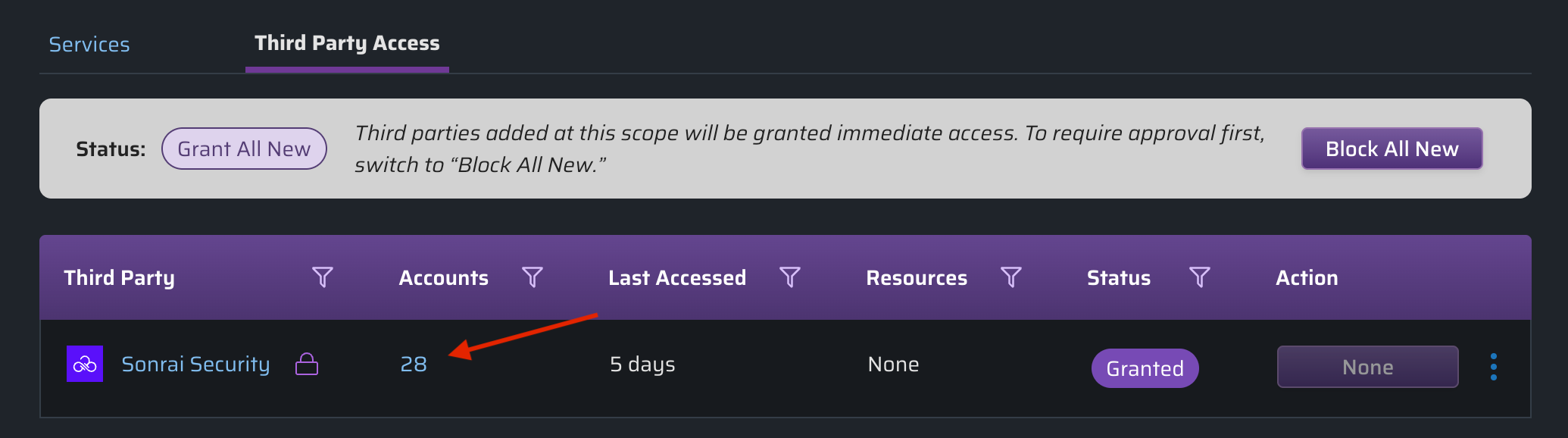 | Blocked | All third party access is blocked in all accounts [at the selected scope]. A third party is blocked at either Organization-level or a lower selected scope (i.e. OU, individual account, etc.) and those changes have been applied to your cloud. |