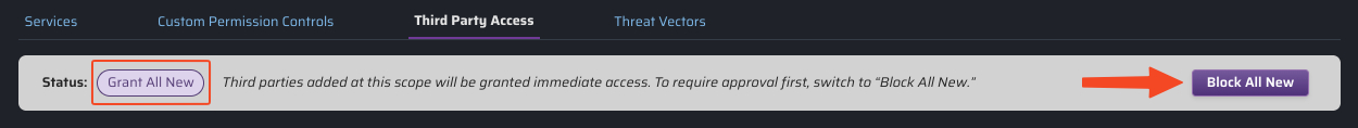 Any pre-existing third parties (at the time default status is toggled) will retain their current access status of Granted or Blocked.