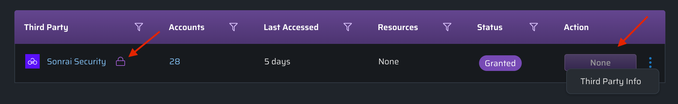 Rows with a lock icon are deemed to be necessary and cannot be blocked (Example: "Sonrai Security Third Party account access is required and cannot be blocked.")