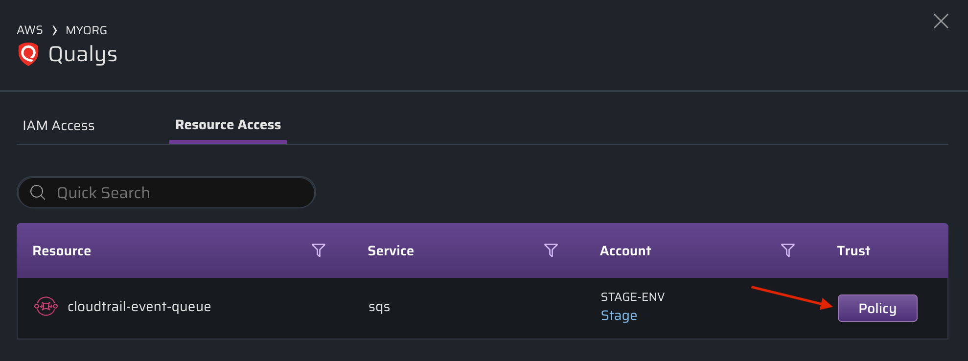 Clicking on the resources number within the row will display all of the resources the third party account(s) can access: