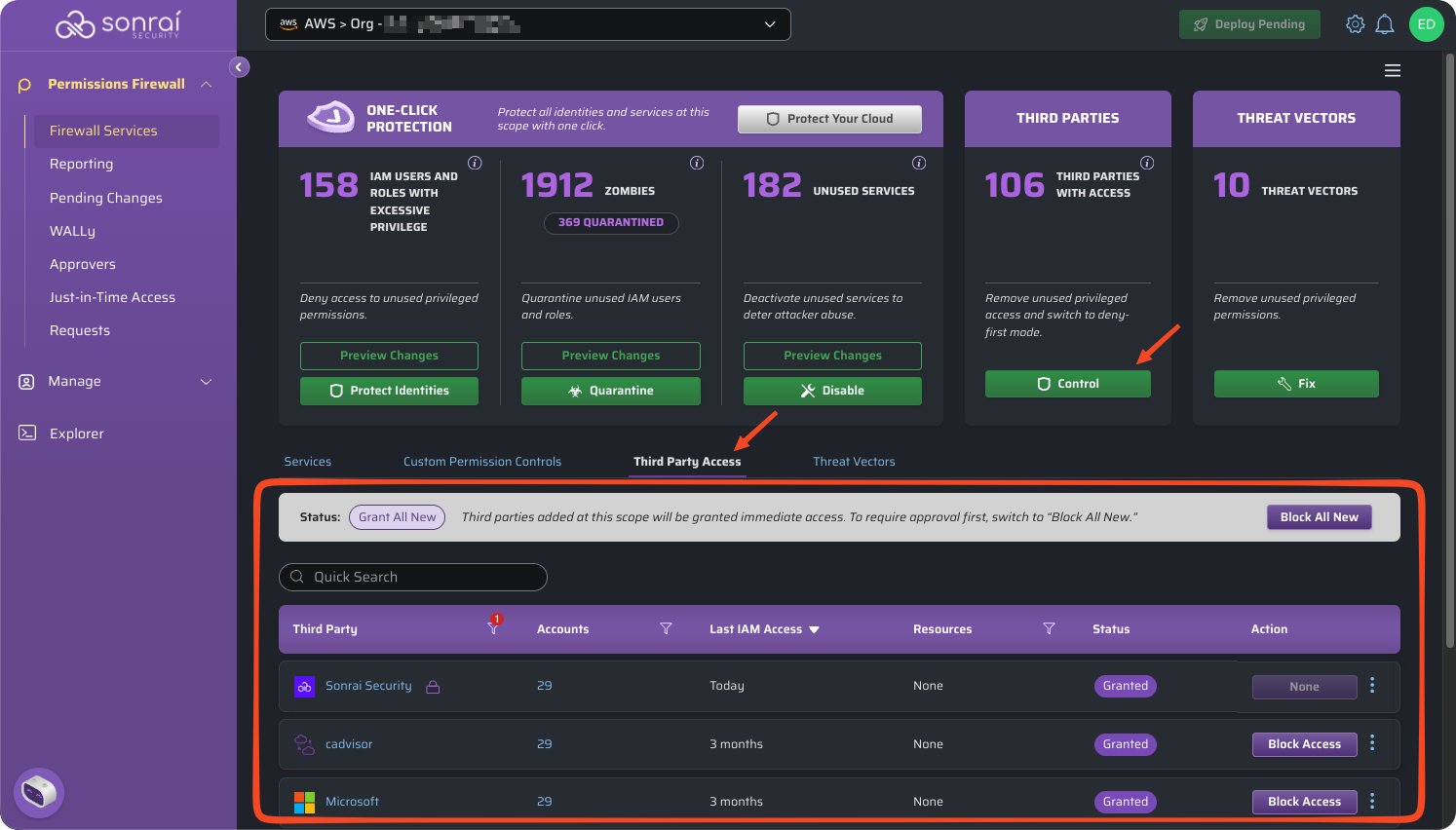 The Cloud Permissions Firewall (CPF) provides a simple and effective way to manage third-party access across all accounts within your AWS Organization.